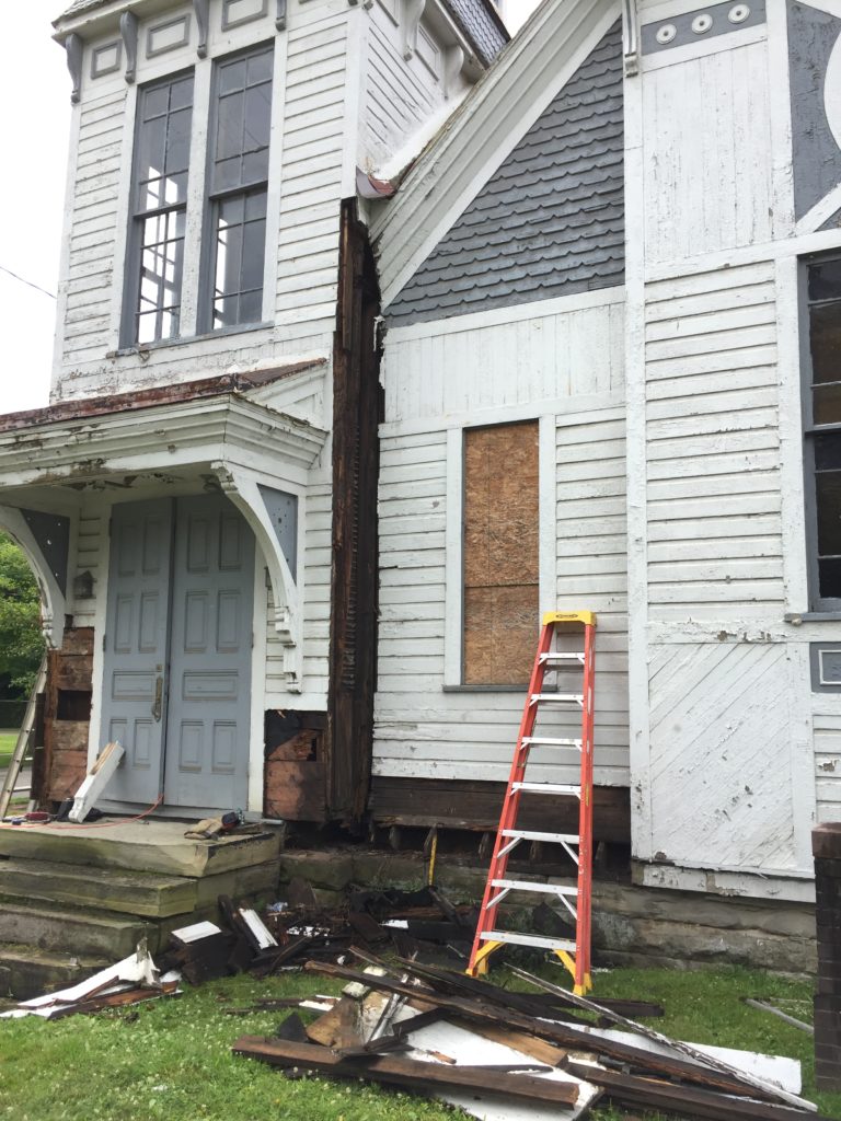To date, Franklin Preservation has removed the stained glass windows from the front of the building. They are being re-glazed, re-framed and painted. We began work on the Tower in July of 2019. This work included removing and replacing rotten corner boards, sills and siding with new structural material. Using old photos of the building, the architectural detailing will be recreated to match the original using updated materials. A new stoop, stone masonry, stairs and handrails are planned. The front doors will be refurbished and painted and given new hardware. There will be a new railing at the top of the Tower. Franklin Preservation hopes to recreate the original “Bell Tower” roof from 1886. We have received a matching City of Franklin historic preservation grant to help accomplish some of these items. In addition, we received a matching grant from the Pennsylvania Historic and Museum Commission that will allow us to begin the replacement of the roof and add a gutter system on the Church portion of the building.
